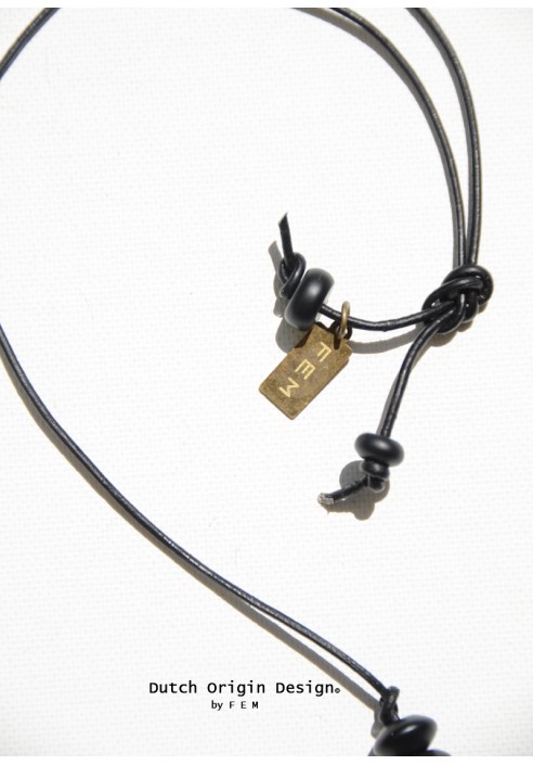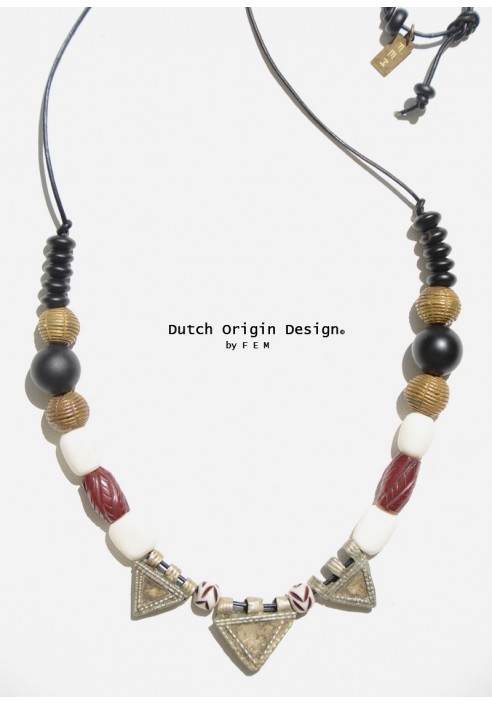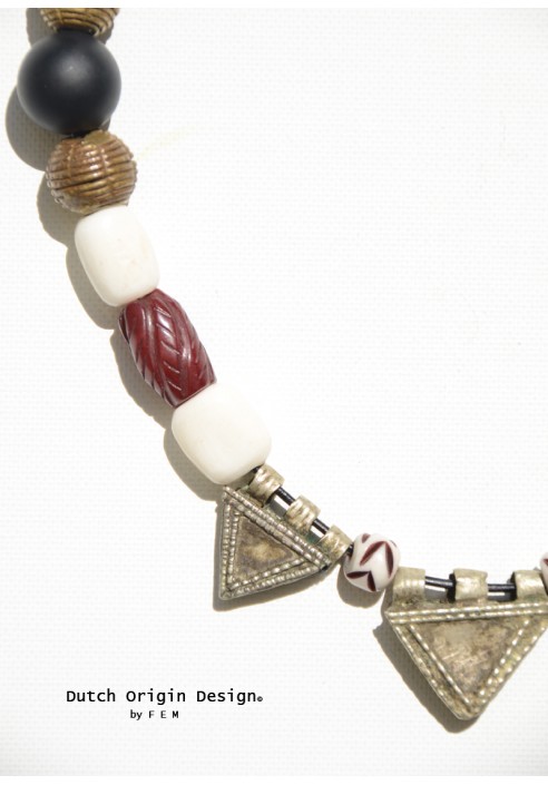 Black Leather necklace with 3 vintage African handmade pray pendants (metal quality unknown) and made with old techniques and tools, 4 large vintage African handmade brass beads (lost-wax technique), vintage African handmade natural bone beads, offwhite carved pattern bone beads, burgundy carved gemstone bead, black onyx beads. Length approximately 66 cm / 26 inch.