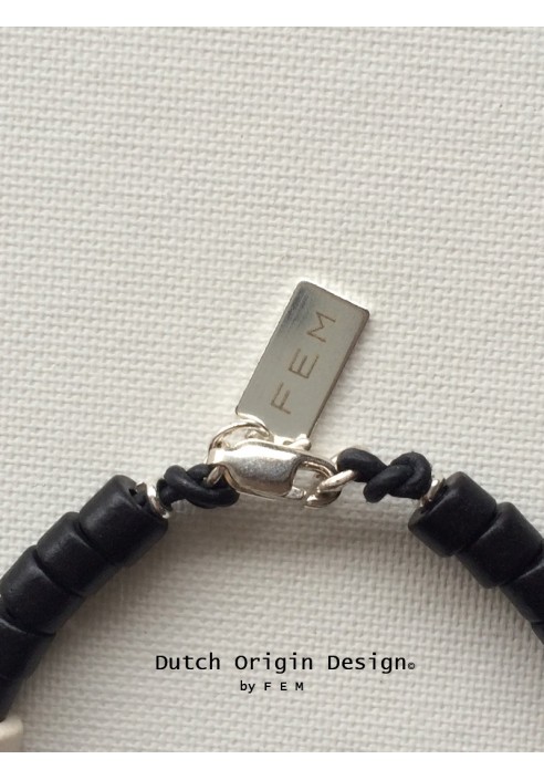 Black leather bracelet with brown speckled handmade ceramic beads, black bone carved white stripes bead, ceramic tube beads & sterling silver lobster clasp. Length approximately 17,5 cm / 7 inch.