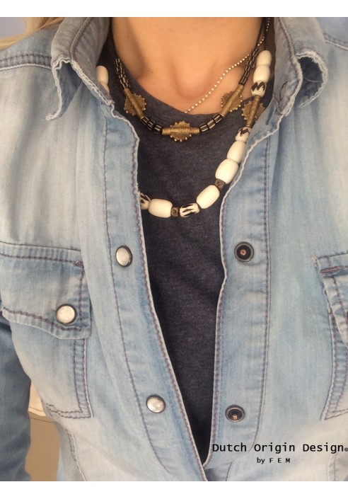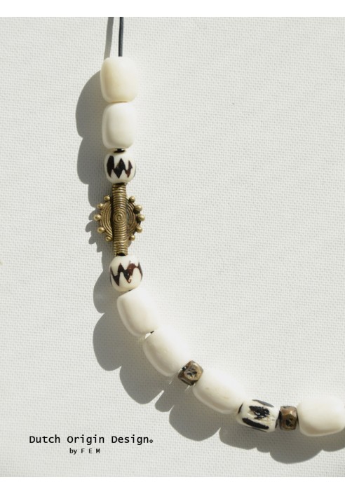 Black leather necklace with vintage ( at least 30 years old) African (Ghana) handmade carved round brass beads (lost-wax technique), vintage African (Ghana) handmade "sun" brass bead (lost-wax technique), West-African handmade square beads, vintage African handmade tribal pattern bone beads, African handmade natural bone beads & handmade oxidized solid brass clasp. Length approx. 51 cm / 20 inch.