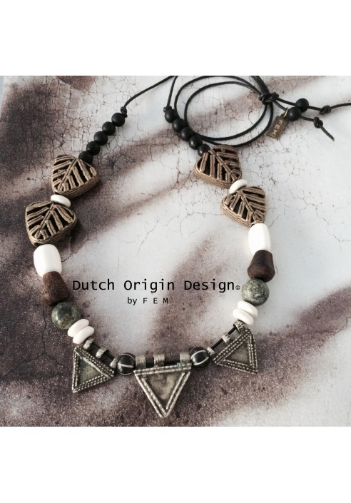 Black Leather necklace with 3 vintage African handmade pray pendants (metal quality unknown) and made with old techniques and tools, 4 large vintage African handmade brass beads (lost-wax technique), vintage African handmade natural bone beads, black/offwhite carved pattern bone beads, dark green gemstone bead, special design wooden beads & black onyx beads. Length approximately 66 cm / 26 inch.