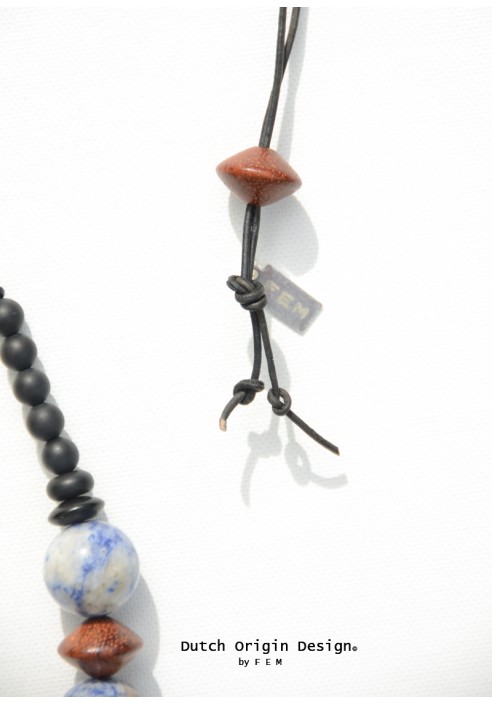 Black leather necklace with 2 large antique Indian handmade barrel shaped beads (Low Grade old silver/ 50 to 100 years old), 1 large antique handmade silver hammered bead, large blue natural sodalite gemstone beads, black matte onyx gemstone beads & wooden beads. Length adjustable with wooden bead.